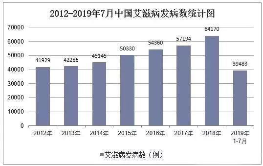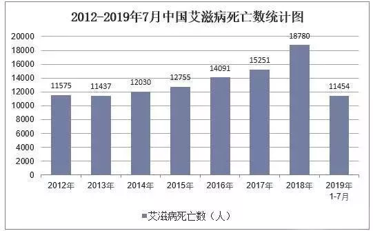 20191-7月中國艾滋病發病數為39483例,死亡人數為11454例;2018年中國艾滋病發病數為64170例,死亡人數為18780例。