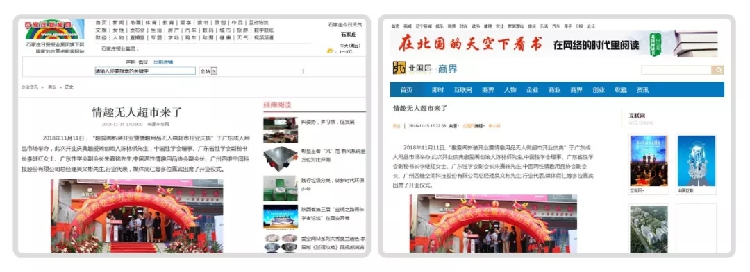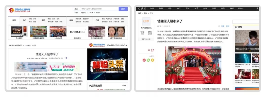 2018年11月11日,廣州康祥實業 — 趣愛閣情趣用品商城在廣東成人用品市場舉辦了隆重的新裝開業儀式,同時宣布廣州第一家情趣用品“無人微超市”正式試業運營。連日來,受新浪、中華網、搜狐、鳳凰網、慧聰網等10多家新聞媒體聚焦報道,數百家新聞門戶網站轉載。